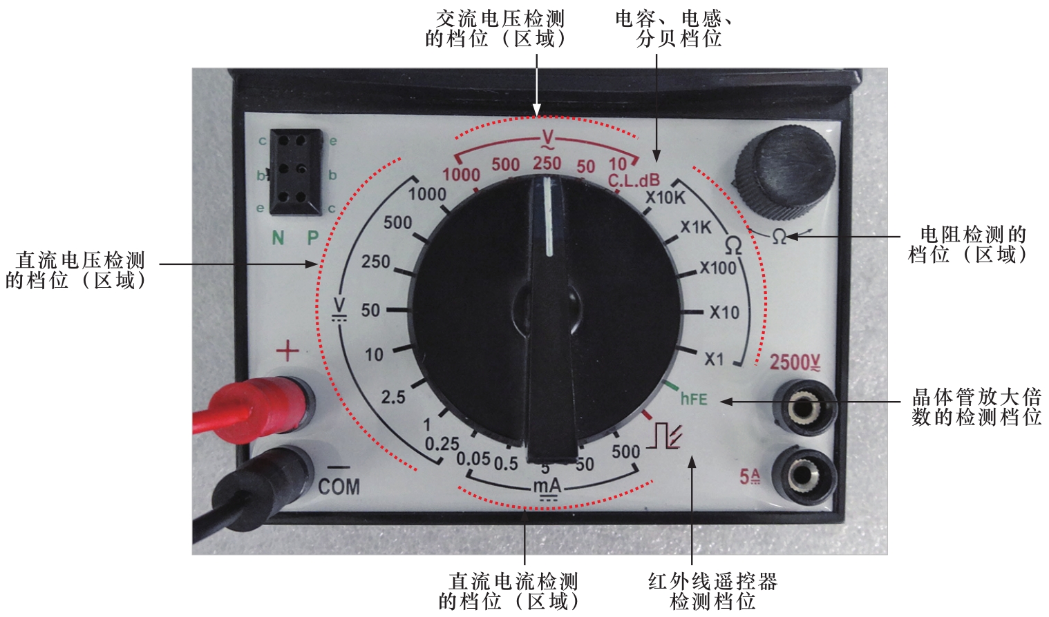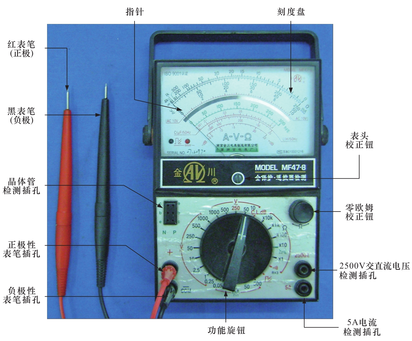 指针万用表主要是由刻度盘、指针、表头校正钮、晶体管检测插孔、零欧姆校正钮、功能旋钮、表笔插孔、2500V交直流电压检测插孔、5A电流检测插孔以及表笔组成。