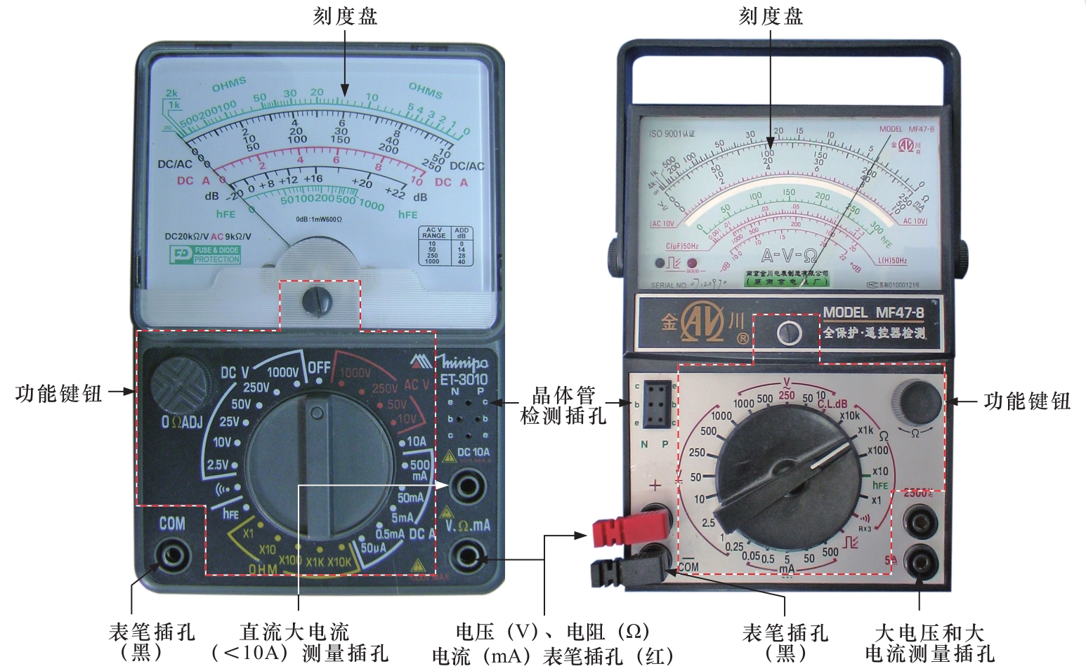 在检测之前首先要来认识一下指针万用表的实物外形、特点以及其相应的辅助检测设备等,如图3-1所示,虽然指针万用表的种类和型号有多种多样,但其外形结构基本相似。