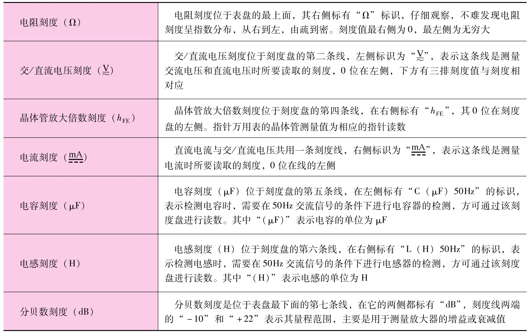 由于万用表的功能很多,因此表盘上通常有许多刻度线和刻度值,并通过指针指示所检测的数值,图3-4所示为典型指针万用表的刻度盘。