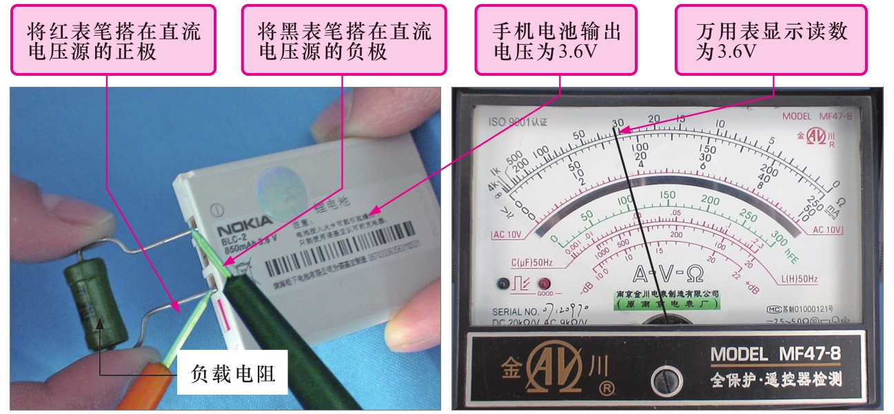 测量电池的输出电压,将万用表的量程调到直流电压10V档上,然后用黑表笔搭在电池的负极端,红表笔搭在电池的正极端,观察万用表指针在表盘上的指示,结合对应的刻度线,即可以识读出当前所测的电压值为3.6V。 z9fNHSfkiC7q6Gbu123MjsngtxibINg7YBxtsVn35NmvQi5DV6aQhcZZlCOGZ6M6