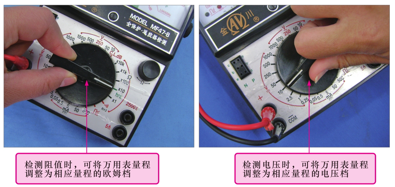 根据测量的需要,无论测量电流、电压还是电阻,都需要扳动指针万用表的功能旋钮,将万用表调整到相应测量状态。无论是测量电流、电压还是电阻都可以通过功能旋钮轻松地切换,如图3-12所示。
