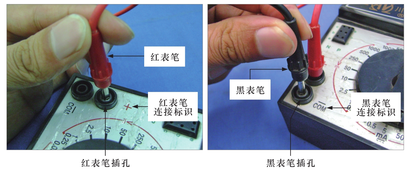 指针万用表有两支表笔,分别用红色和黑色标识,测量时将其中红色的表笔插到“+”端,黑色的表笔插到“-”或“*”端(COM端),如图3-10所示。