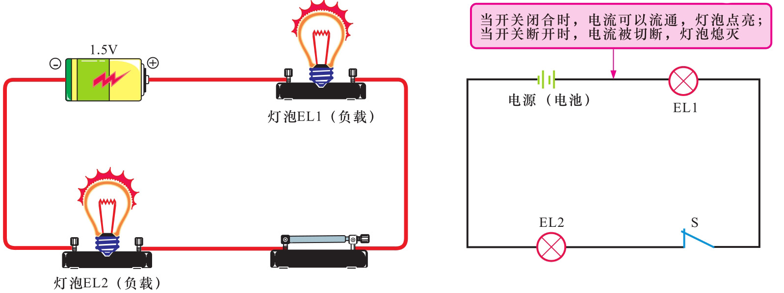 如果电路中两个或多个负载首、尾相连,那么它们的连接状态是串联的,可称该电路为串联电路,如图1-14所示。