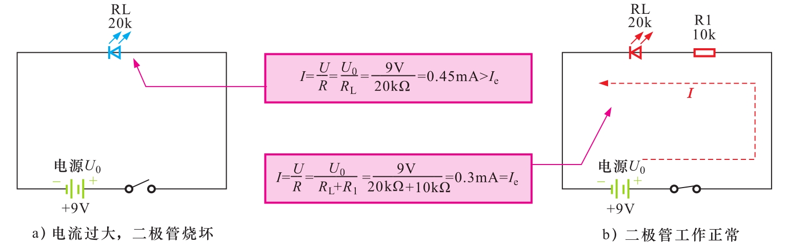 电路中,发光二极管的额定电流 I e =0.3mA,图1-16a中,一只发光二极管工作在9V电压下,可以算出,该电路电流为0.45mA,超过发光二极管的额定电流,当开关接通后,会烧坏发光二极管。图1-16b是串联一个电阻器后的工作状态,电阻器和二极管串联后,总电阻值为30kΩ,电压不变,电路电流降为0.3mA,发光二极管可正常发光。