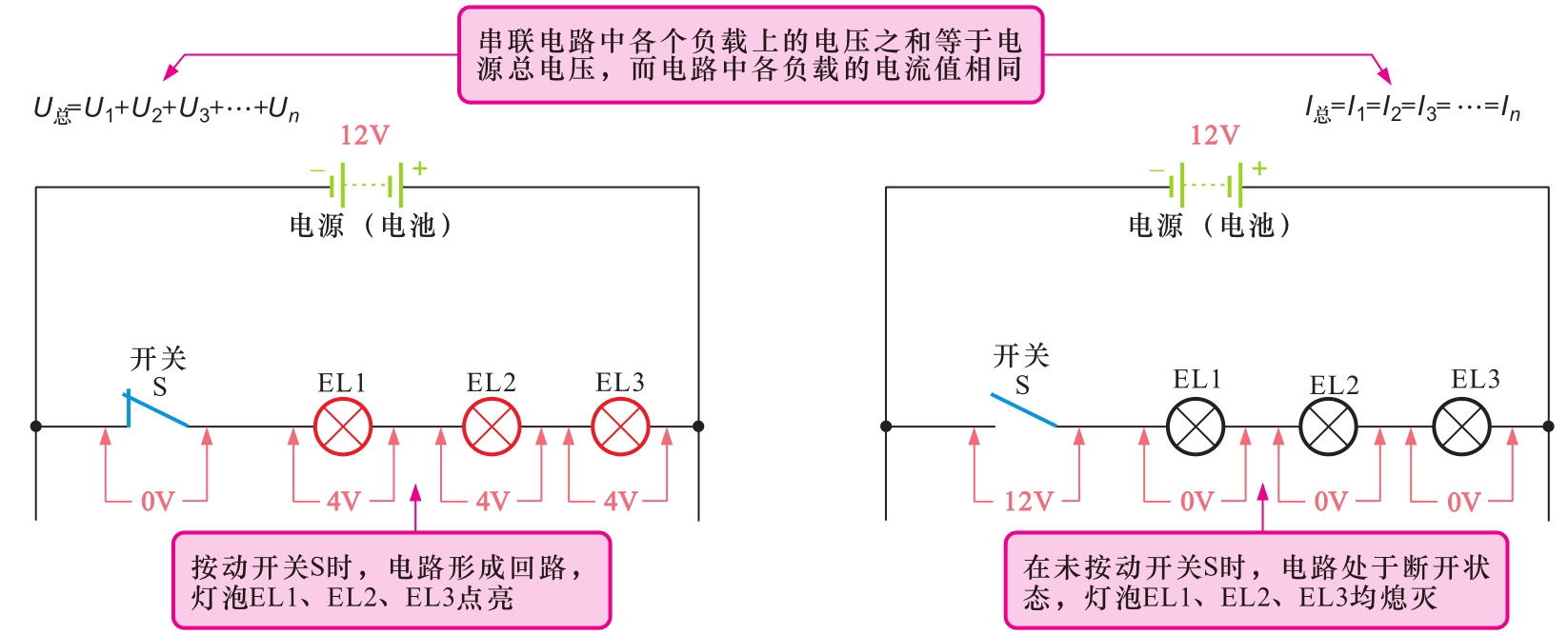 在串联电路中流过每个负载的电流相同,各个负载将分享电源电压,如图1-15所示。