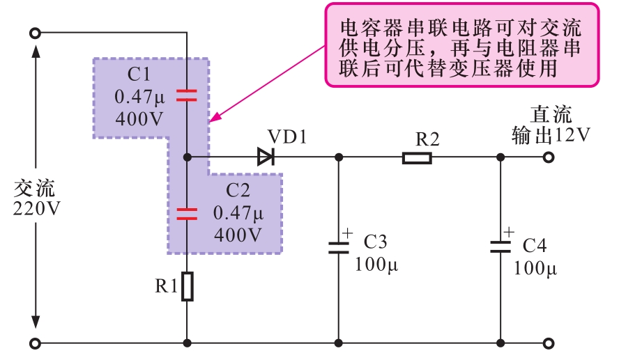 电路中,C1与C2和R1串联组成分压电路,起到变压器的作用,有效减小了实物电路的体积。通过改变R1的大小,还可以改变电容分压电路中电压降的大小,进而改变输出的直流电压值。这种电路与交流市电没有隔离,其地线会带交流高压,使用时注意防触电问题。