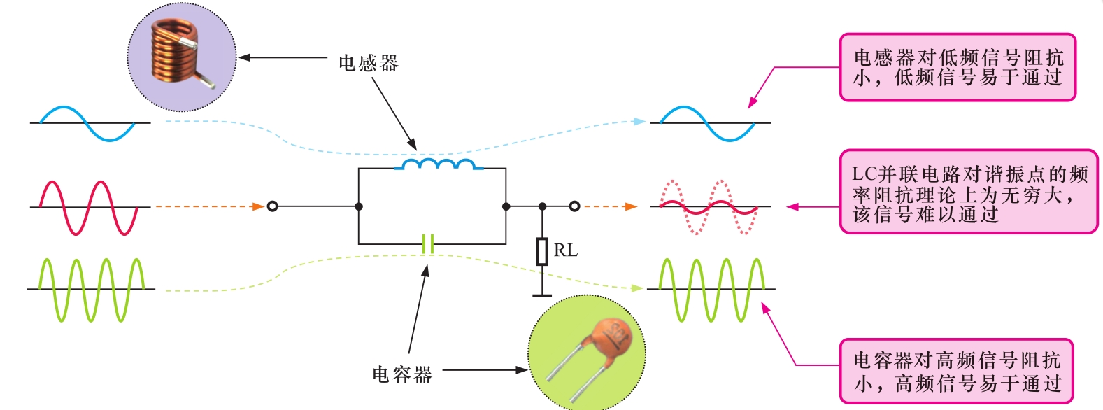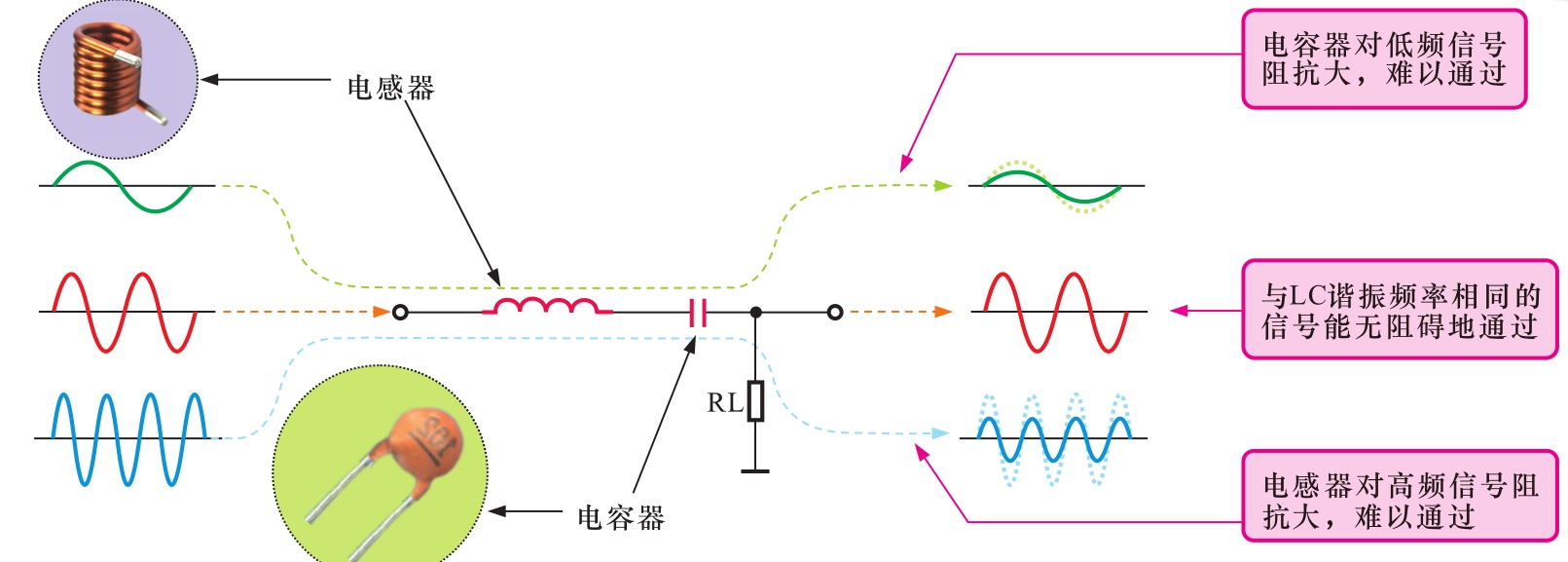 图1-21 不同频率信号通过LC串联电路的效果示意图