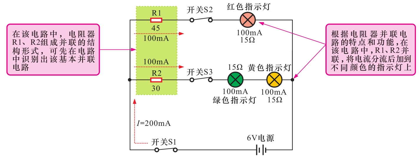 6V直流电压经总开关S1后,再经电阻器并联电路为不同颜色的指示灯供电。其中,红色指示灯与R1串联,当开关S2接通时,红色指示灯发光;绿色和黄色指示灯与R2串联,当开关S3接通时,绿色和黄色指示灯发光。
