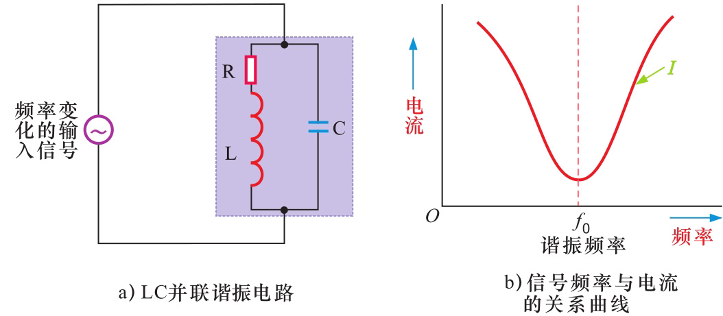 图1-30 LC并联谐振电路及电流和信号频率的关系曲线