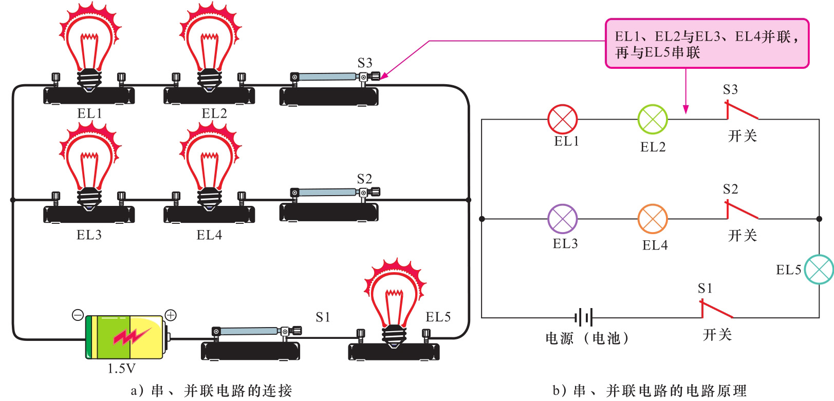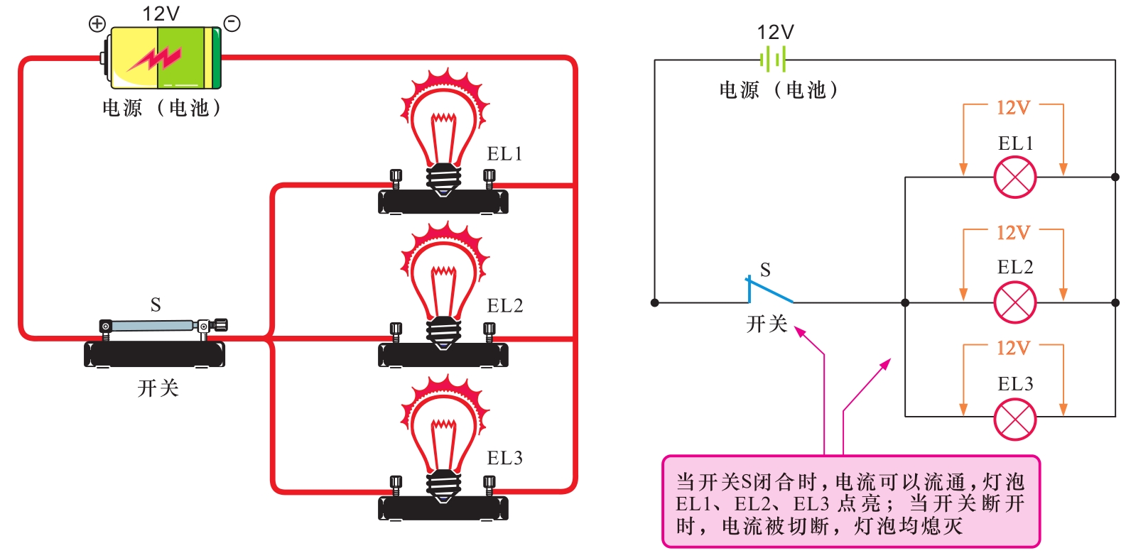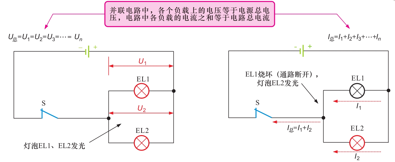 在并联状态下,每个负载的工作电压都等于电源电压,不同支路中会有不同的电流通路,当支路的某一点出现问题时,该支路将变成断路状态,照明灯会熄灭,但其他支路依然正常工作,不受影响。