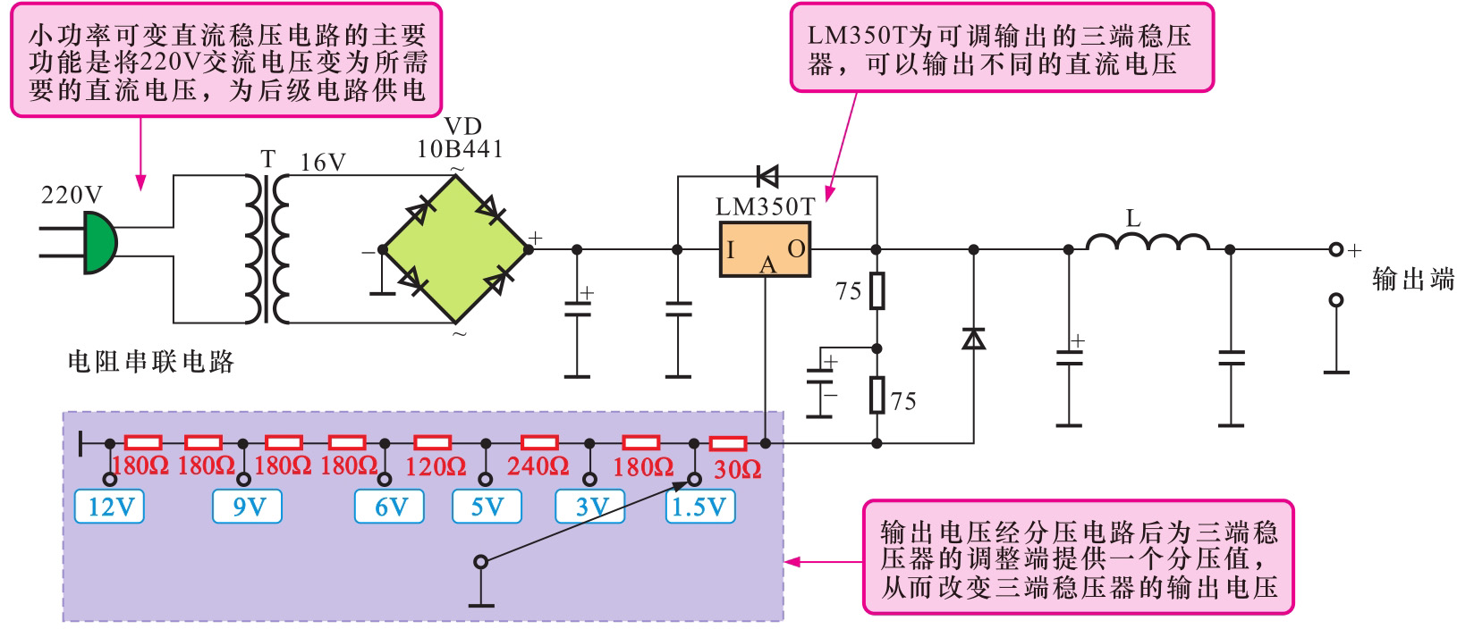 当开关设在30Ω电阻器左侧输出点时,相当于将一个30Ω的电阻器接在稳压器调整端,其他7只电阻器被短路,稳压器输出端输出1.5V电压;当开关设在180Ω电阻器左侧输出点时,相当于将一个30Ω和一个180Ω的电阻器串联后接在稳压器调整端,其他6只电阻器被短路,稳压器输出3V电压;依此类推,当开关设于不同的输出端上时,可控制稳压器LM350T输出1.5V、3V、5V、6V、9V、12V六种电压值。