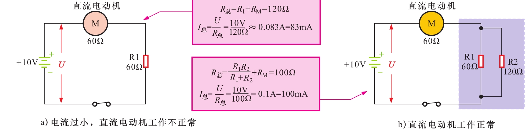 在没有阻值更小的电阻器情况下,将一个120Ω的电阻器R2并联在R1上,根据并联电路中总电阻器阻值计算公式可得 R 总 =100Ω。那么,电路中的电流 I 总 变为100mA,即达到直流电动机的额定电流,电路可正常工作。