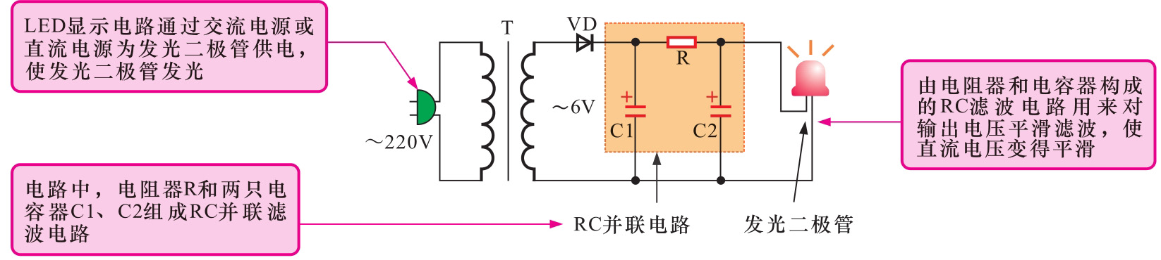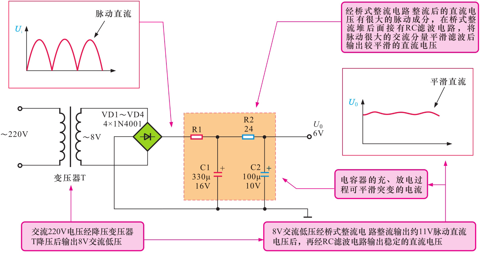 变压器T为降压变压器;电阻器与电容器构成了RC滤波电路。电阻器R1、R2和电容器C1、C2组成两级基本的RC并联电路。交流220V变压器降压后输出8V交流低压,经桥式整流电路整流后输出约11V直流电压,该电压经两级RC电路滤波后,输出较稳定的6V直流电压。