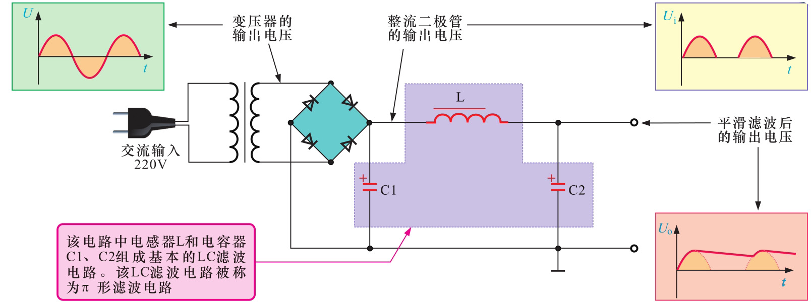 电感器L与电容器C1、C2组成基本LC并联电路(又称π形LC滤波器),具有更强的平滑滤波效果,特别是对滤除高频噪波有更为优异的效果。交流220V经变压器和桥式整流电路后,整流二极管输出的脉动直流电压 U i 中的直流成分可以通过L,交流成分绝大部分不能通过L,被C1、C2旁路到地,输出电压 U o 为较纯净的直流电压。