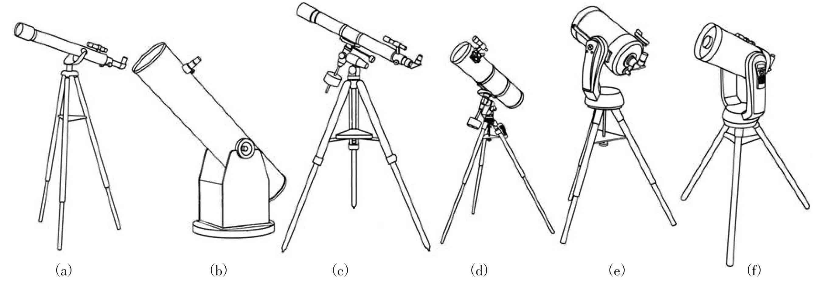 图7 望远镜支架的不同类型。(a)小折射镜使用的简单的地平式支架,(b)牛顿式望远镜使用的道布森式地平支架,(c)折射镜使用的德式赤道仪,(d)牛顿望远镜使用的德式赤道仪,(e)计算机控制的施密特-卡塞格林望远镜,使用单臂叉式地平支架,(f)施密特-卡塞格林望远镜,使用叉式地平支架。