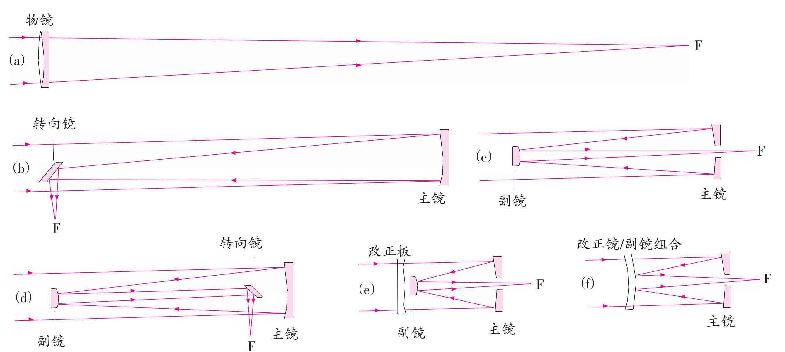 图5 不同类型的望远镜。对相似口径的望远镜,图中显示了从天体来的光线汇聚到焦点F的光路。(a)折射望远镜,(b)牛顿式望远镜,(c)卡塞格林式望远镜,(d)卡塞格林式折轴望远镜,(e)施密特-卡塞格林式望远镜,(f)马克苏托夫-卡塞格林式望远镜。