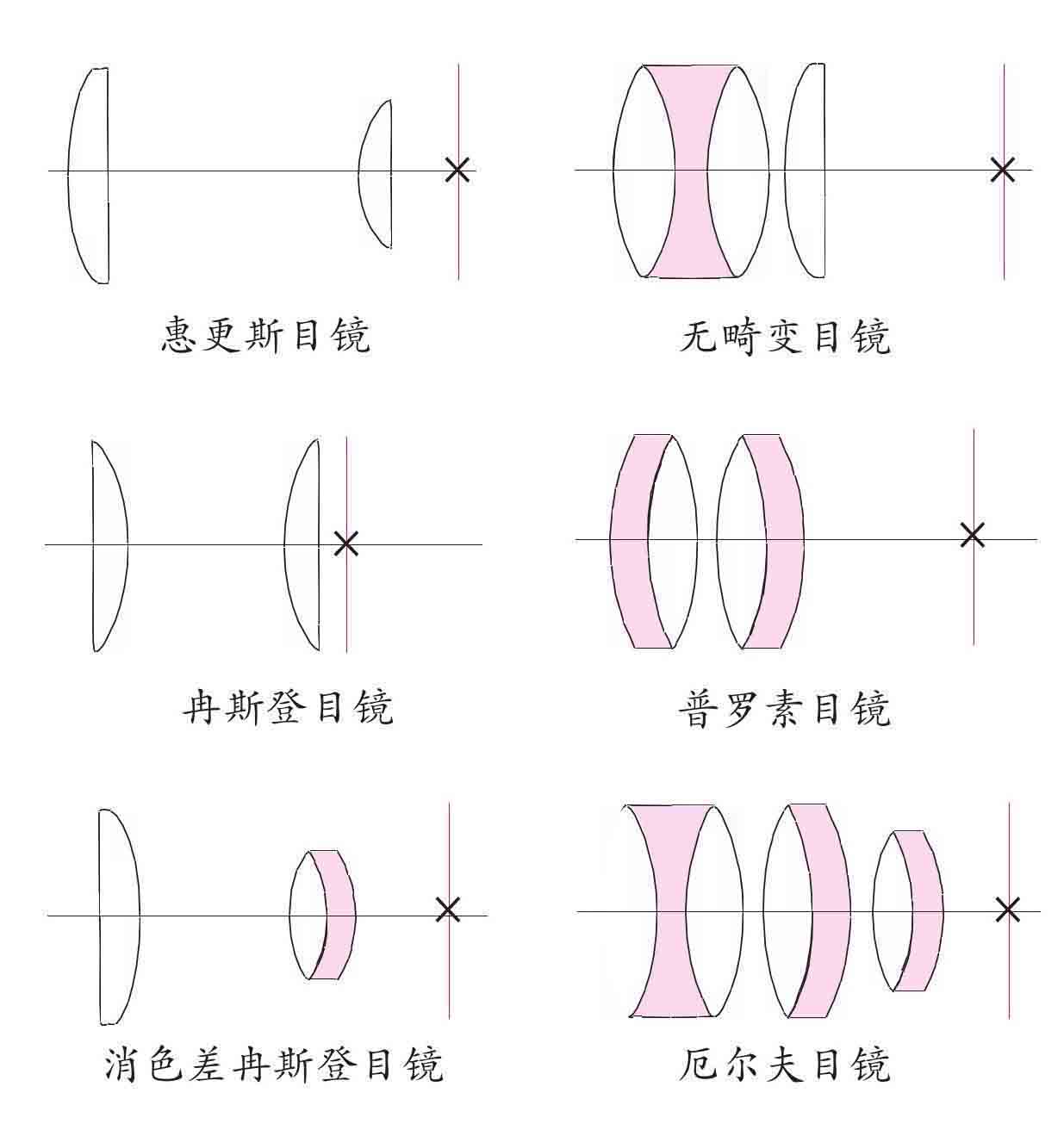 图6 常见目镜类型。惠更斯和冉斯登目镜均由两片平凸透镜组成。在消色差冉斯登目镜中,一块平凸透镜被换成了消色差双胶合透镜。无畸变目镜包含一组3片胶合消色差透镜。在普罗素目镜里包含2组消色差透镜。图中显示的厄尔夫目镜的结构包括3组双胶合透镜,但有时候其中的1组或者2组会被单透镜代替。图中每种目镜的出瞳位置用叉形表示。