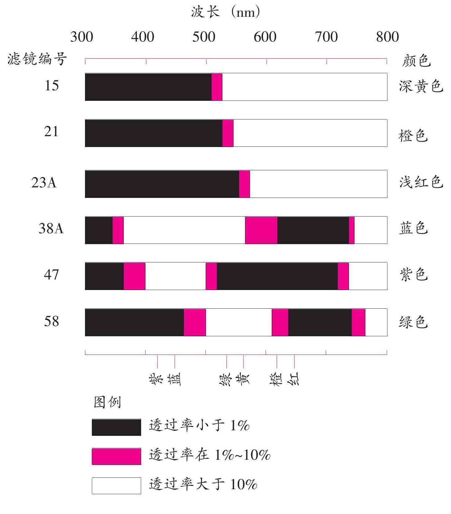 图10 广泛用于增强天体颜色反差的染色玻璃滤镜,其透射率随波长的变化。所有滤镜都透过红外辐射。47和58号滤镜密度较大,最适用于200毫米以上的口径。