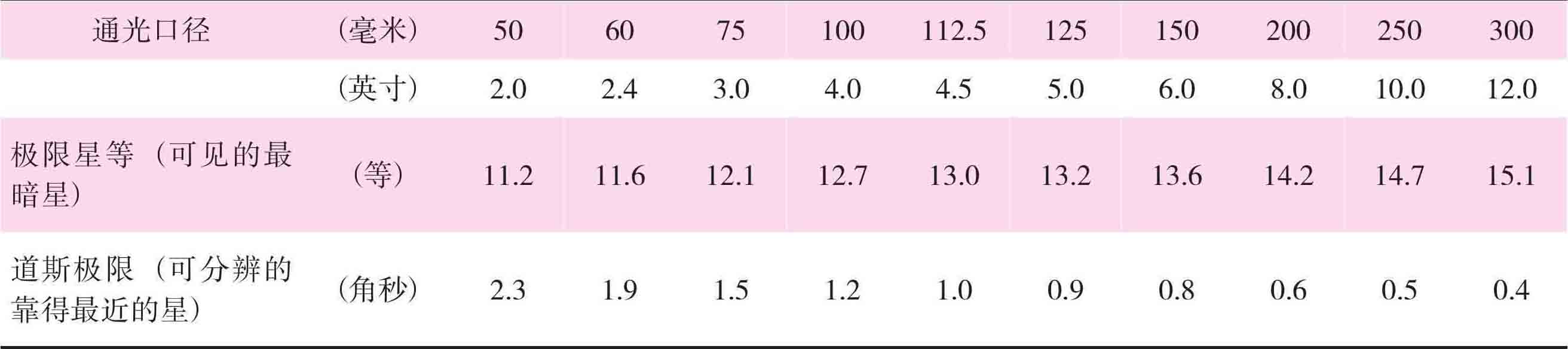 表10: 极限星等和道斯极限。不同口径望远镜下可见的最暗星,和可以分辨出的靠得最近的一对天体的角距离。均为近似值。