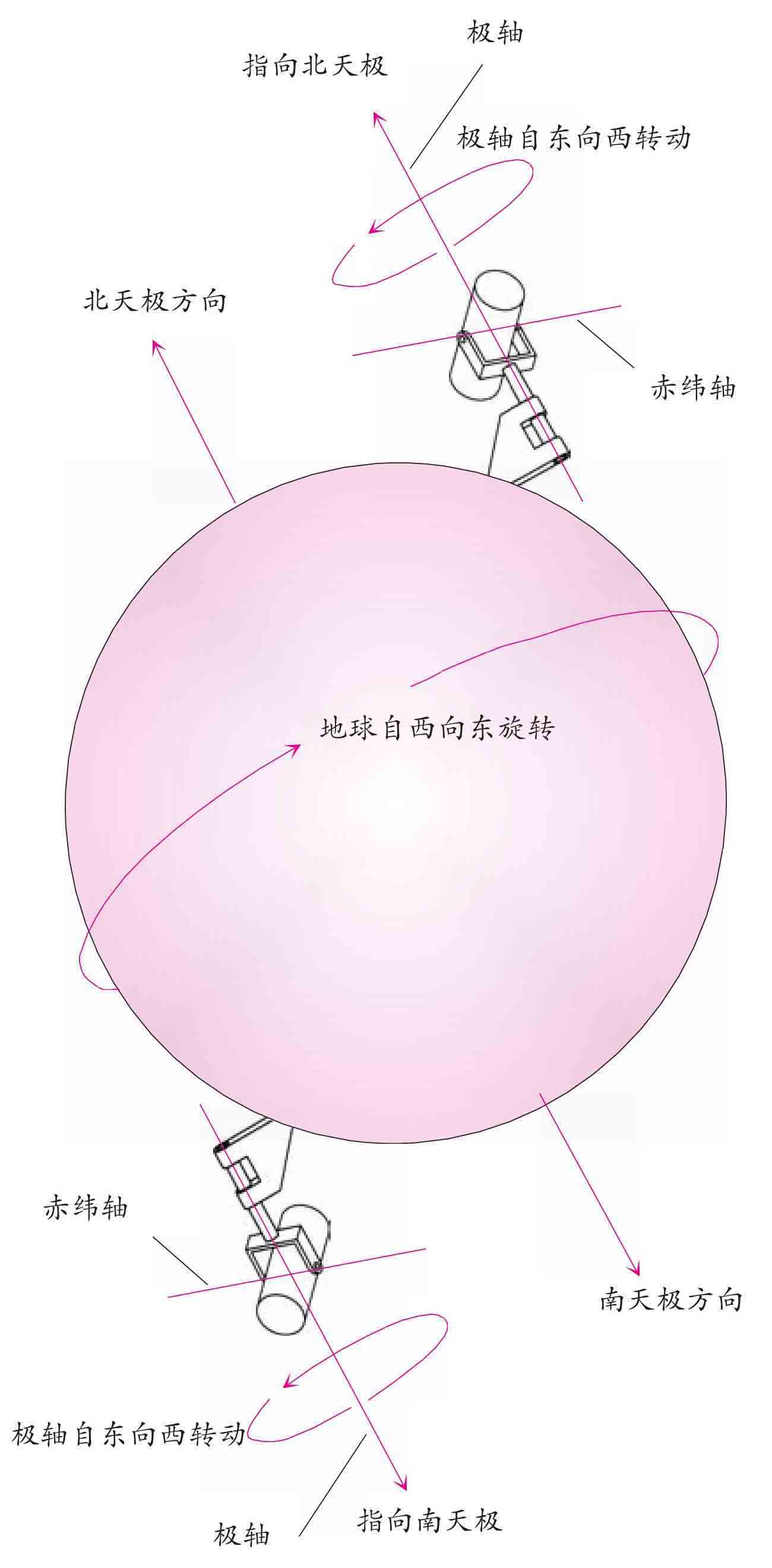 图8 赤道式支架的原理。极轴调整到和地轴平行,并自东向西转动,以抵偿地球的自转。