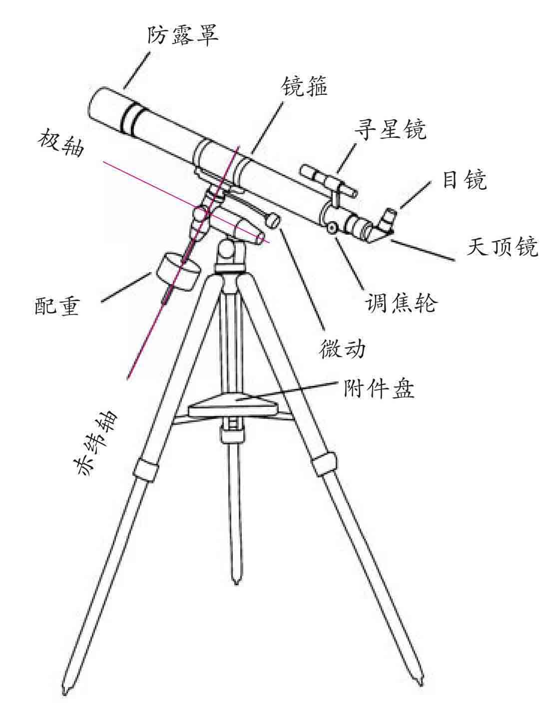 图9 典型的德式赤道仪上的小型折射望远镜的各个部件。