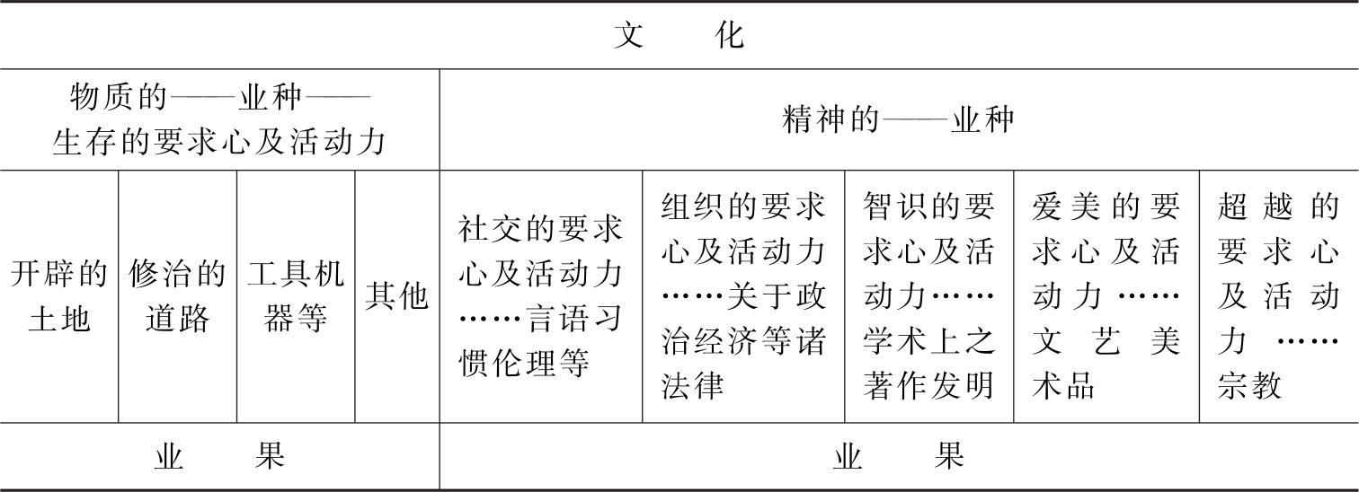 梁启超将“文化”作为心能和自由意志的价值选择,并早有文化网之说,反映出文化能动的一面(参见表1)。