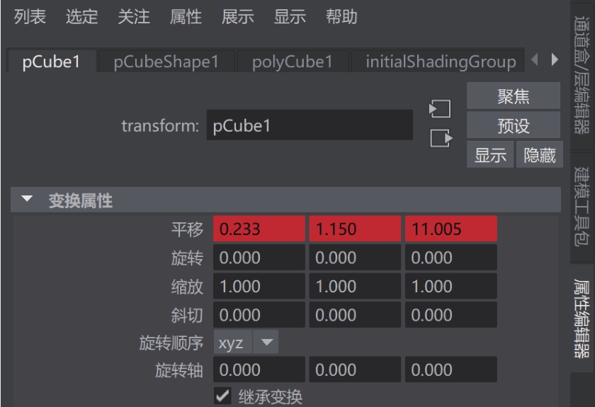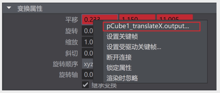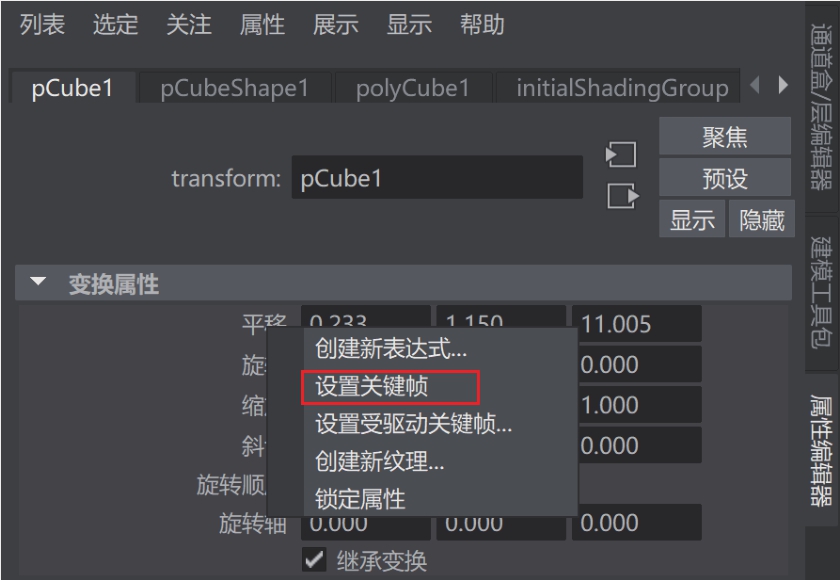 02 在“属性编辑器”面板中,切换至pCube1选项卡,在“变换属性”卷展栏内,将光标放置于“平移”属性上并右击,在弹出的快捷菜单中选择“设置关键帧”选项,这样多边形立方体的第一个平移关键帧就设置完成了,如图1-9所示。