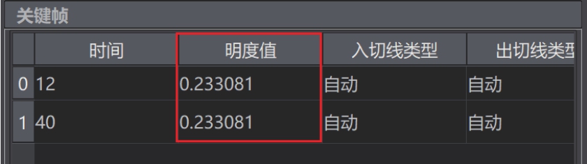 04 在“动画曲线属性”卷展栏内,可以很方便地查看当前对象关键帧的“时间”以及“明度值”,更改“明度值”的值即可修改对应时间帧上的参数属性,如图1-17所示。
