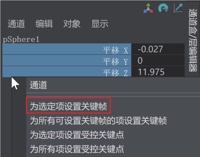 02 在软件界面右侧的“通道盒”中,选择“平移X/Y/Z”这3个属性,并右击,在弹出的快捷菜单中选择“为选定项设置关键帧”选项,如图1-21所示。这3个属性的关键帧就设置完成了,设置好关键帧的属性会显示红色方块,如图1-22所示。