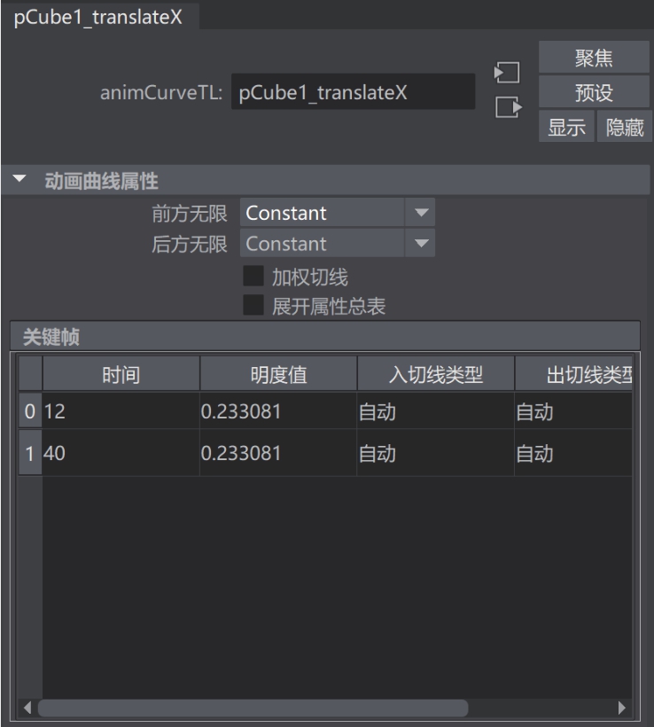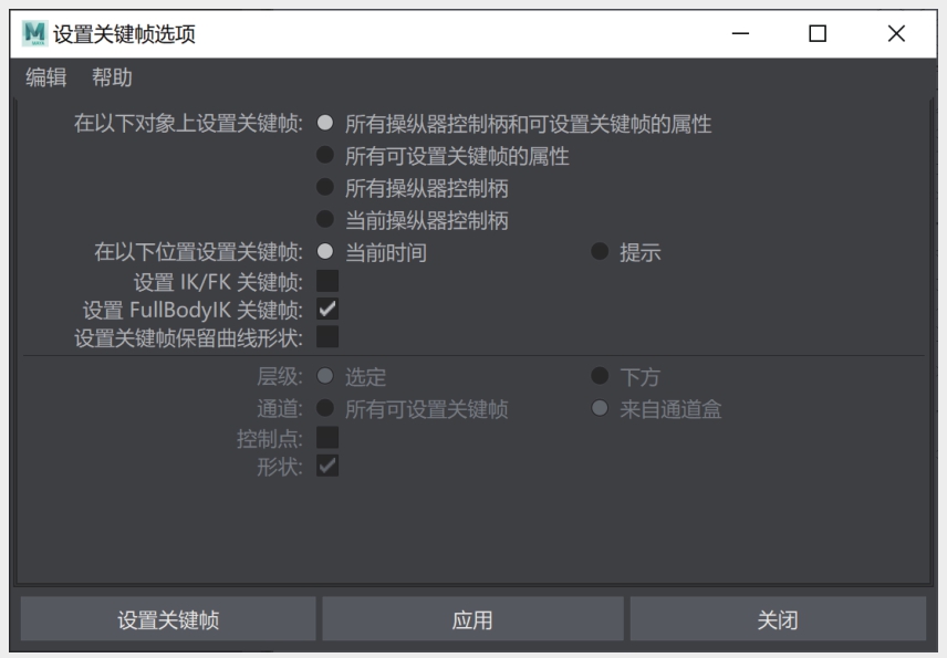 ■ 形状:勾选该复选框时,将在选择物体的形状节点和变换节点上设置关键帧。