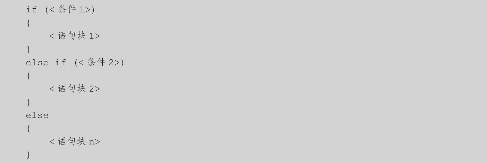 在这个结构中,如果<条件1>成立(true)执行<语句块1>;否则,如果<条件2>成立执行<语句块2>,……如果所有条件不成立,则执行<语句块n>。其中,else if语句部分可以有多个,也可以没有;而else语句则可有可无,但它只能在结构的最后出现,并且只能定义一次。