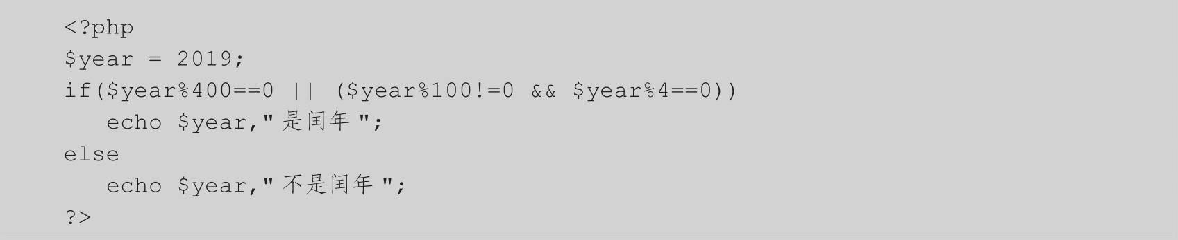 本例设置的条件,通过逻辑或运算符(||)判断满足两个条件中的一个时,年份就是闰年,这两个条件分别是: