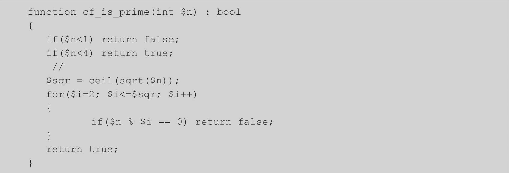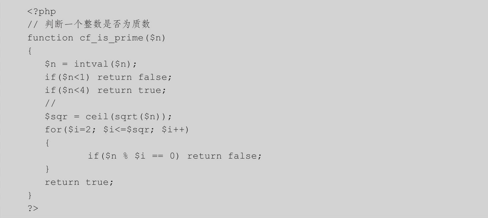 实际开发中,可以将一些常用的功能封装为一个函数,方便重复使用。下面的代码(/lib/cf/cf.php)封装了cf_is_prime()函数,其功能是判断一个整数是否为质数。