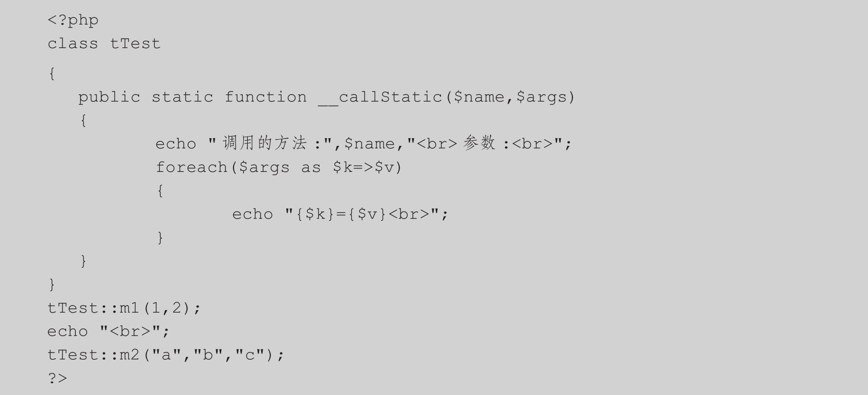 _ _call()方法在调用不可访问的实例方法时执行,_ _callStatic()方法则在调用不可访问的静态方法时执行。这两个方法的参数定义相同,其中,参数一指定调用的方法名称,参数二指定一个数组,其中包含了调用方法时带入的参数。