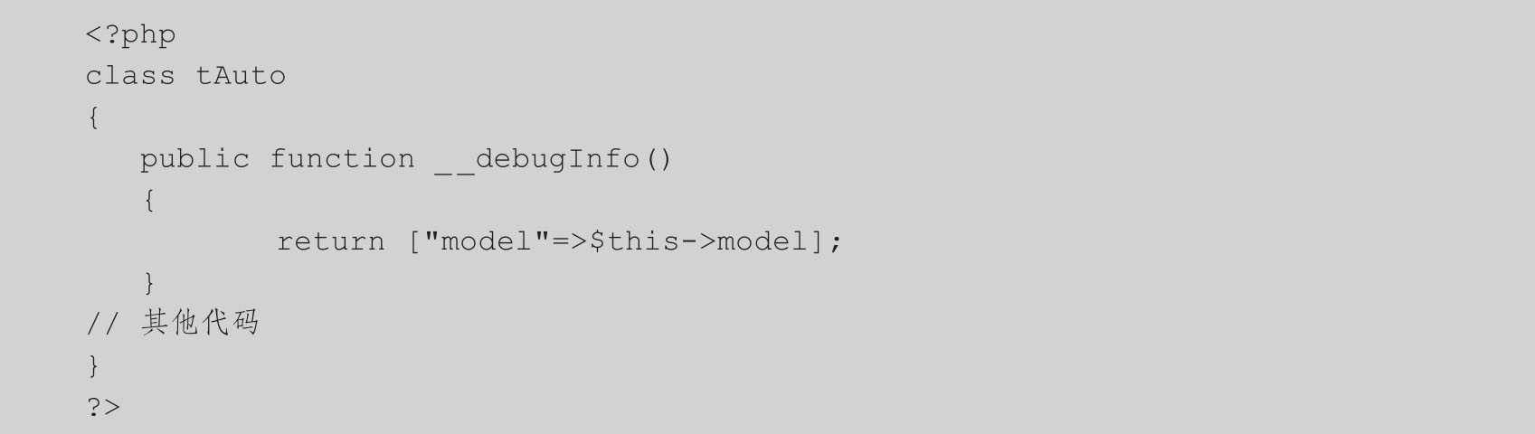 如果限制(或简化)对象显示的信息,可以在类中定义_ _debugInfo()方法,它将返回一个数组,其中包含了对象属性的名称和数据。下面的代码在tAuto类中添加_ _debugInfo()方法。