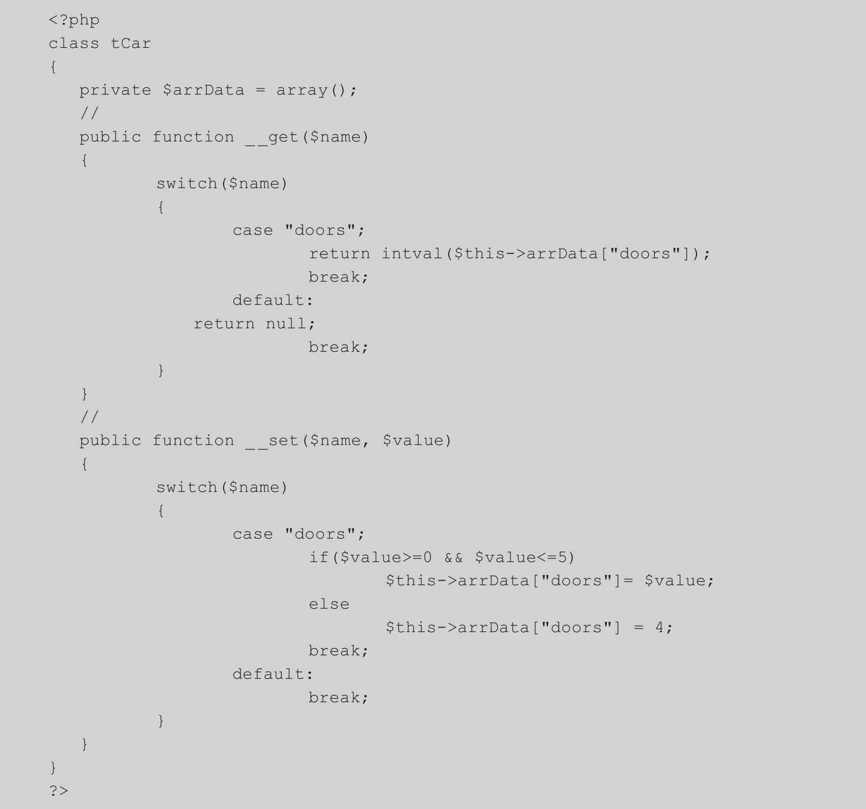 实际开发工作中,_ _get()和_ _set()方法可以让属性的使用既灵活又严格。下面的代码(/demo/tCar.php)定义了tCar类,其中定义了_ _get()和_ _set()方法。