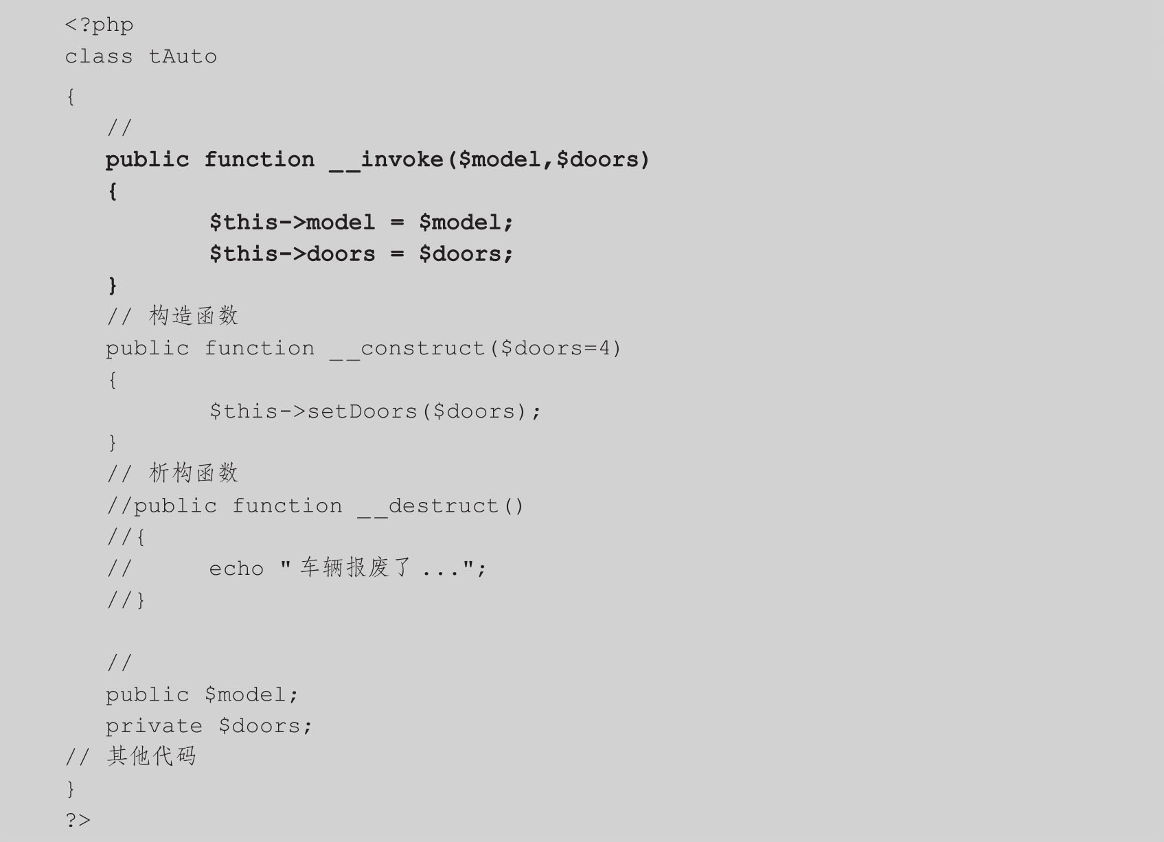 以调用函数的方式调用一个对象时,_ _invoke()方法会被自动执行。下面的代码在tAuto类中添加_ _invoke()方法。