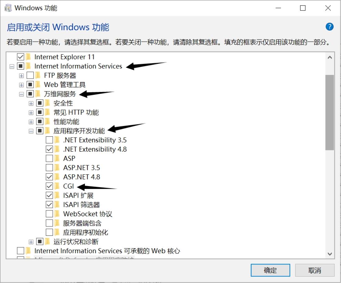 Windows系统中,PHP网站可以通过FastCGI方式在IIS中运行。在Windows 7或Windows 10系统中通过“控制面板”打开“程序和功能”,并在“启动或关闭Windows功能”中修改Windows组件,见图1-1,需要启用Internet Information Services→“万维网服务”→“应用程序开发功能”→CGI等功能。
