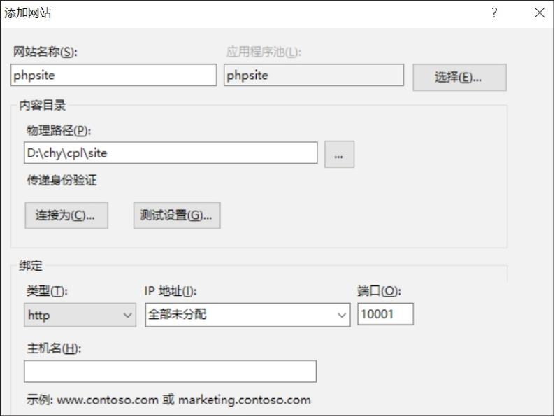 接下来,通过运行inetmgr.exe打开IIS管理器。这里可以新建一个网站,并指定网站的端口为10001,路径为PHP网站的测试路径,如本书使用的d:\chy\cpl\site,见图1-2。