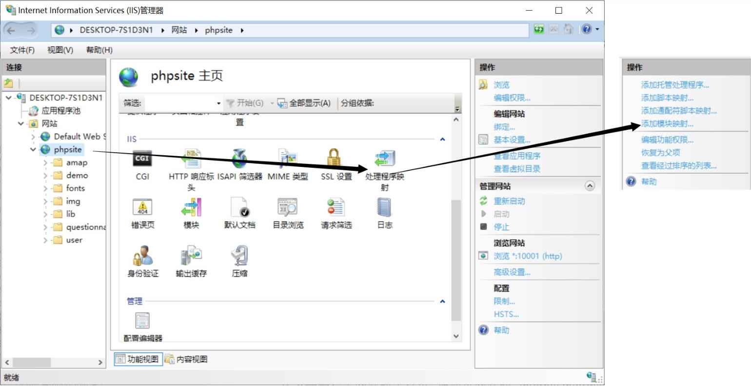 创建网站后,打开网站的“处理程序映射”,在右上角选择“添加模块映射”,见图1-3。