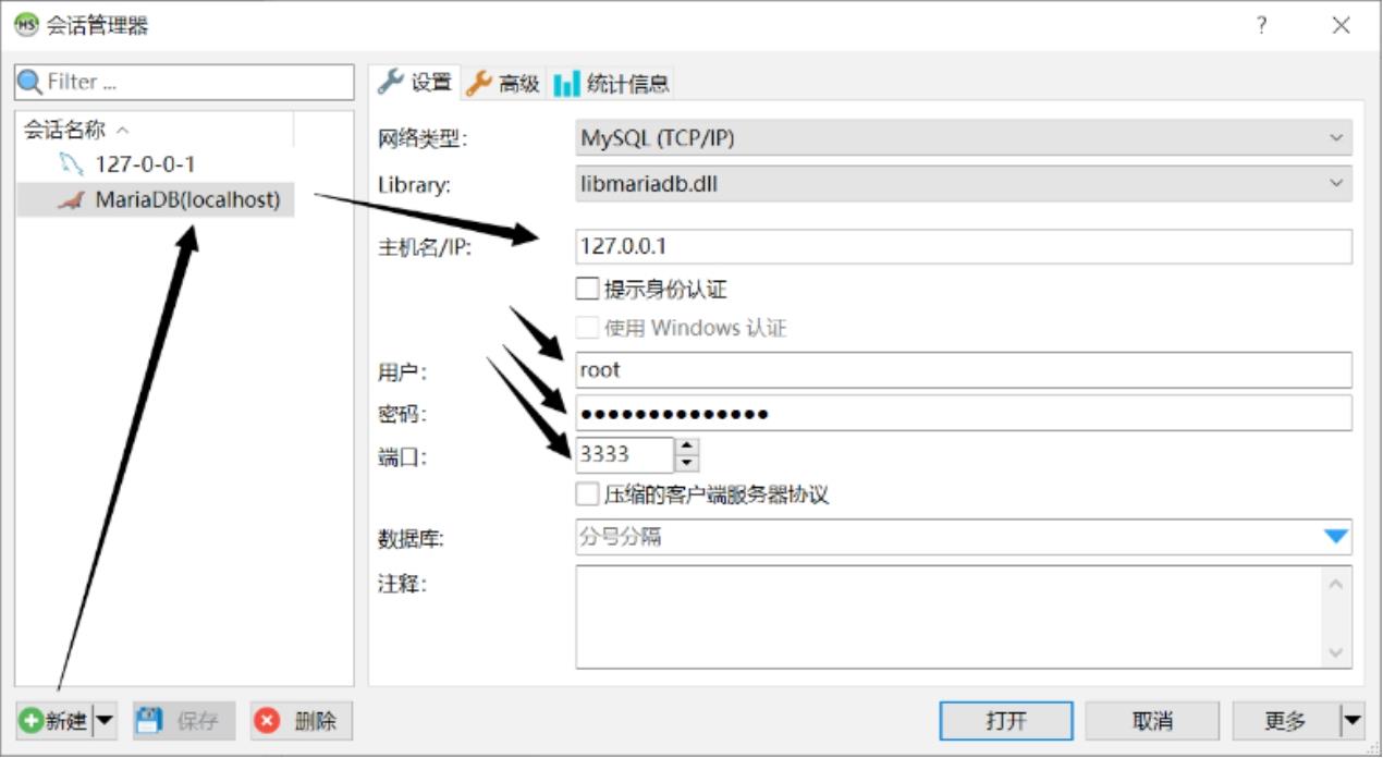 这里将mariadb服务的端口设置为3333,连接数据库时,需要设置正确的服务器地址和端口。此外,这里还将MariaDB数据库服务器端和客户端字符集设置为utf-8,这样就可以有效地传递汉字等多字节文本信息。