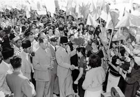 1956年9月30日,赵映桃献花后站在苏加诺总统身边。图中与总统握手者右侧为赵映桃