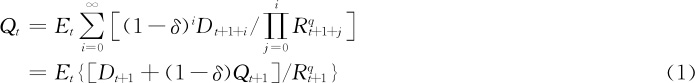 而本文中伯南克和格特勒对BGG模型进行了进一步扩展,考虑了外生的资产价格泡沫问题。因为资本的基础价值是其在未来可以产生的所有红利预期值的现值之和,伯南克和格特勒将 t 时期可折旧资本的基础价值定义为 Q t ,则: