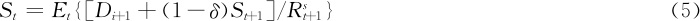 因为 a <1,泡沫的贴现价值经过一段时间后会趋于零,趋于零的速度由 a 值决定,也就是说,泡沫不会永远持续下去。综合式(1)和式(4)可以得到股价: