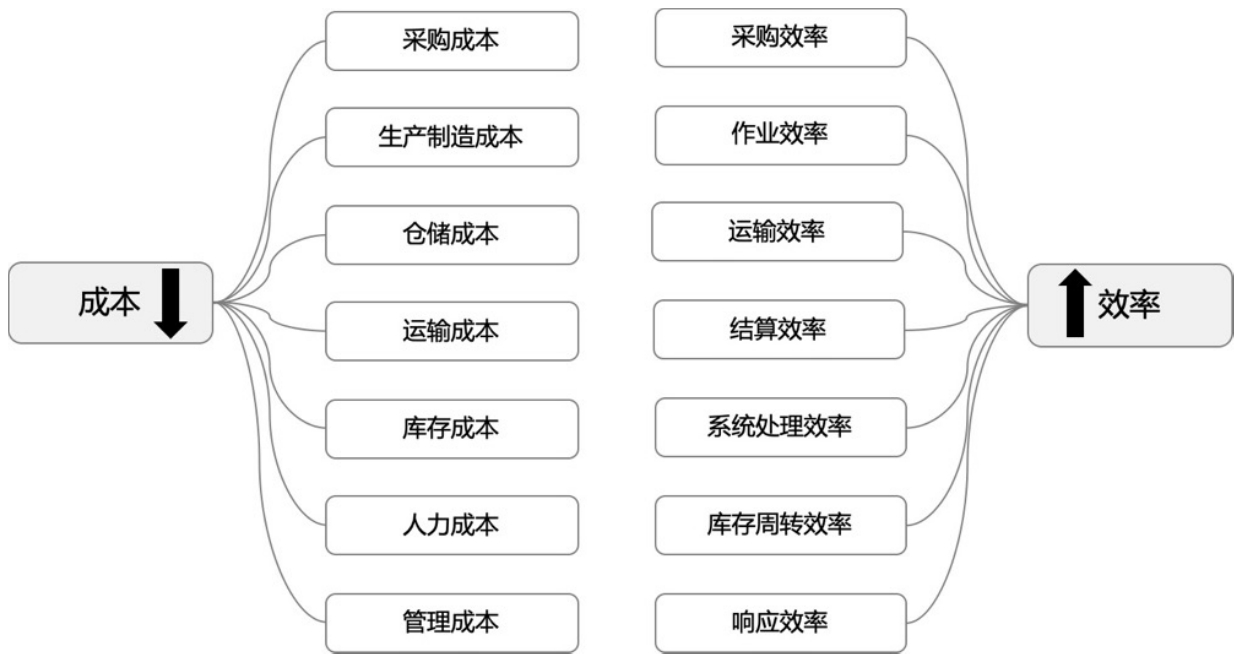 在商品的流通过程中,流动会产生运输成本,停滞又会产生库存滞压成本,走走停停间,无形中就增加了成本,控制好成本,是供应链管理的目标之一。据统计,供应链成本占据了整个销售成本的 50%~80%,在现在信息如此透明的时代,市场竞争激烈,产品毛利被大大压缩,所以降本比增收更能实现盈利,每降本1块钱,利润就实实在在地增加1块钱,但增收1块钱,再去除80%的成本以后,利润只剩下两毛了。如果把这些中间成本节省下来让利一部分给用户,再对服务做一些提升,产品的竞争优势会大幅提升,这笔账算下来,是不是相当划算?
