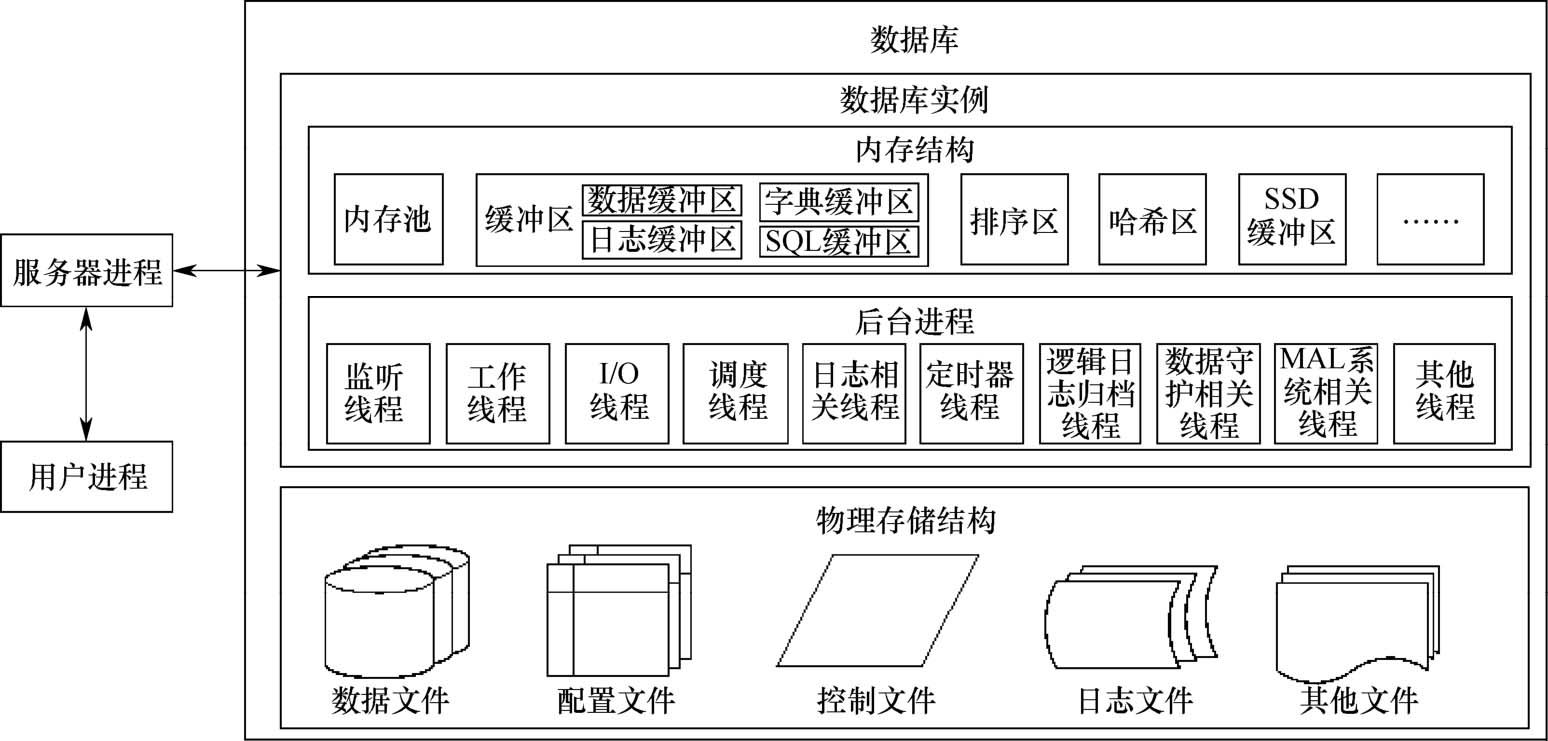 达梦数据库体系结构如图1-1所示,由物理存储结构和数据库实例组成。其中,物理存储结构包括存储在磁盘上的数据文件、配置文件、控制文件、日志文件、归档文件等,数据库实例包括内存结构与后台进程。