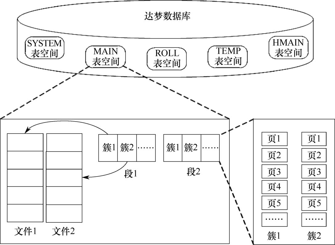 达梦数据库的逻辑存储结构描述了数据库内部数据的组织和管理方式。达梦数据库为数据库中的所有对象分配逻辑空间,并存放在数据文件中。在达梦数据库内部,所有的数据文件组合在一起被划分到一个或多个表空间中,所有的数据库内部对象都存放在这些表空间中。同时,表空间被进一步划分为段、簇和页(也称为块)。这种细分可以使达梦数据库更加高效地控制磁盘空间的利用率。图1-3显示了逻辑存储结构之间的关系。