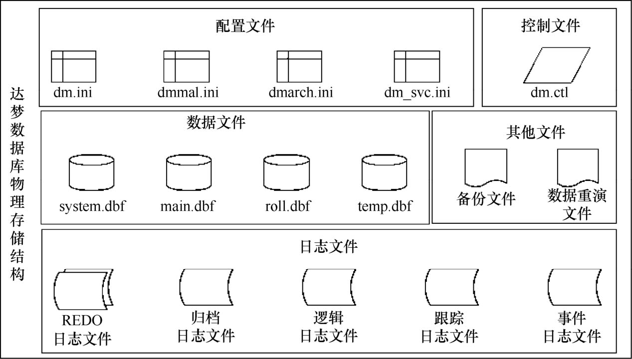 物理存储结构描述了达梦数据库中的数据在操作系统中的组织和管理。典型的物理存储结构包括:用于进行功能设置的配置文件;用于记录文件分布的控制文件;用于保存用户实际数据的数据文件、REDO日志文件、归档日志文件、备份文件;用来进行问题跟踪的跟踪日志文件等,如图1-2所示。