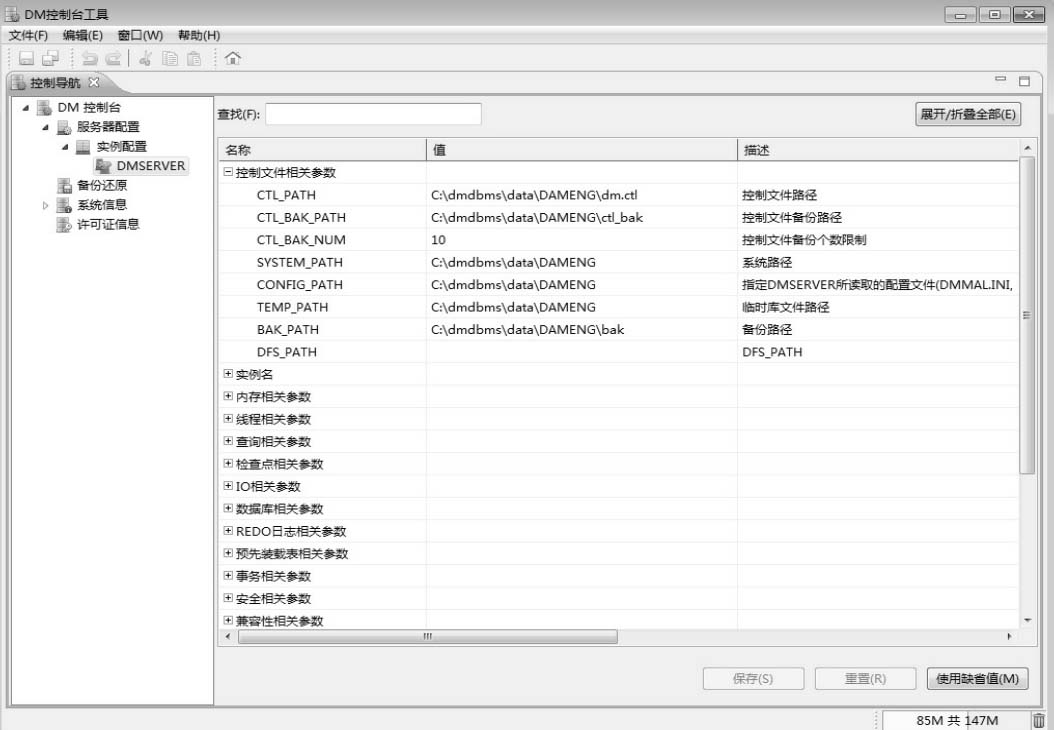 DM控制台工具是管理和维护数据库的基本工具。通过使用DM控制台工具,数据库管理员可以完成以下功能:服务器参数配置、管理DM服务、脱机备份与还原、查看系统信息、查看许可证信息、数据守护配置与状态监视。其界面如图1-5所示。