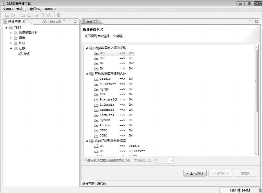DM数据迁移工具提供了主流大型数据库迁移到达梦数据库、达梦数据库迁移到主流大型数据库、达梦数据库迁移到达梦数据库、文件迁移到达梦数据库、达梦数据库迁移到文件的功能。DM数据迁移工具采用向导方式引导用户通过简单的步骤完成需要的操作。其界面如图1-8所示。
